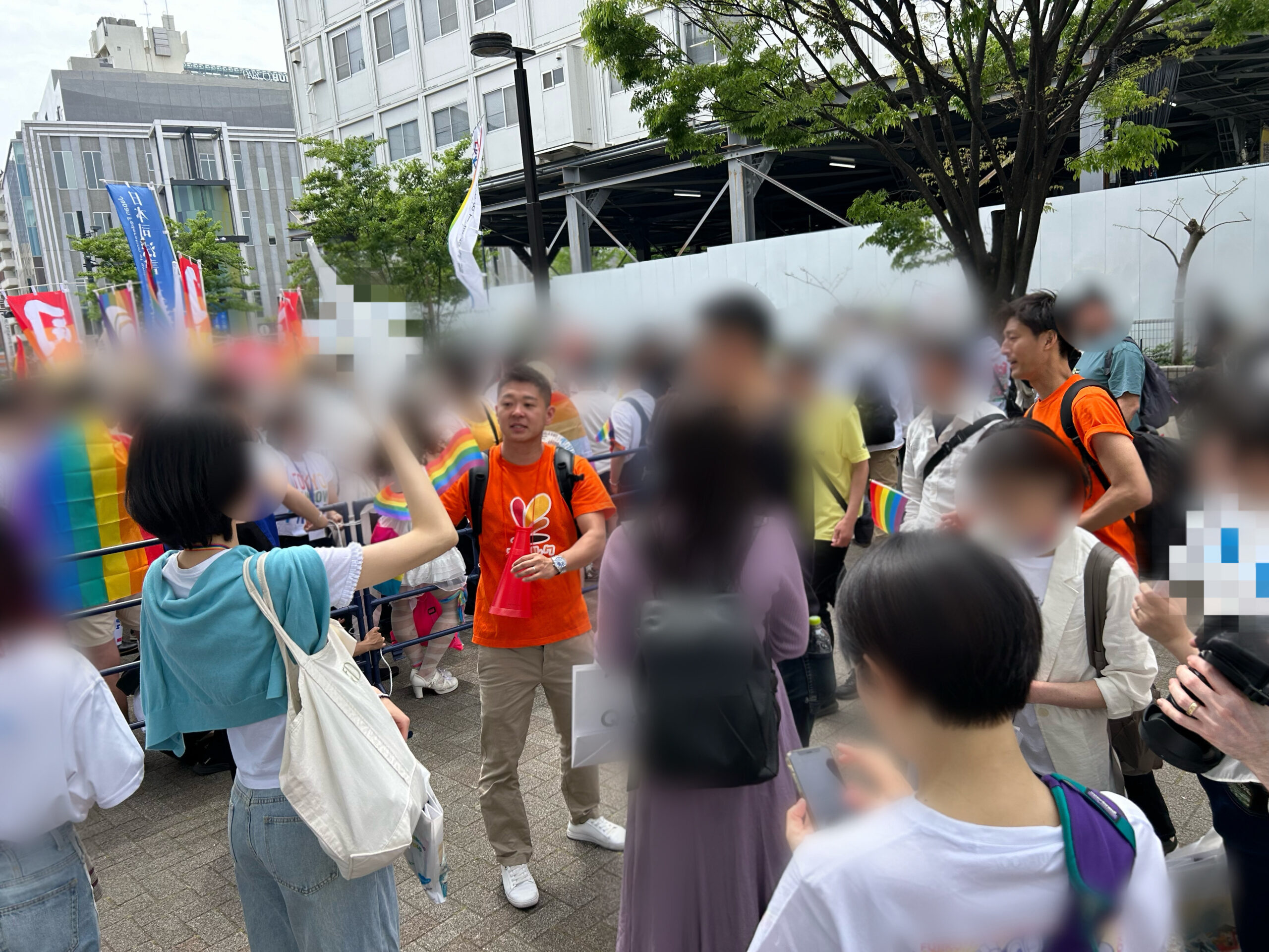 会場外ではプライドパレードが行われており、会場周辺を歩きながら、その様子を見ることができました。街を歩いている一般の方も、見守ったり手を振ったりなど温かい目を向けられていました。