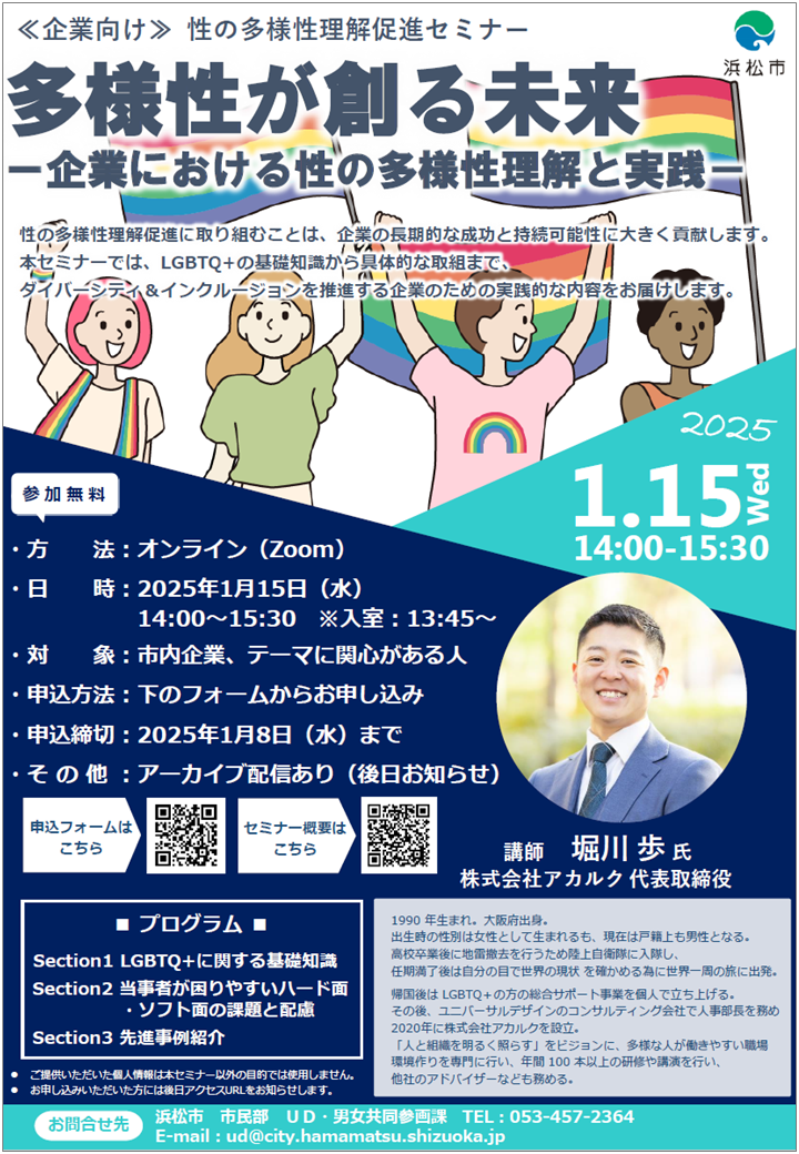 そこで今回、浜松市において企業向けの性の多様性理解促進セミナーを開催いたします。